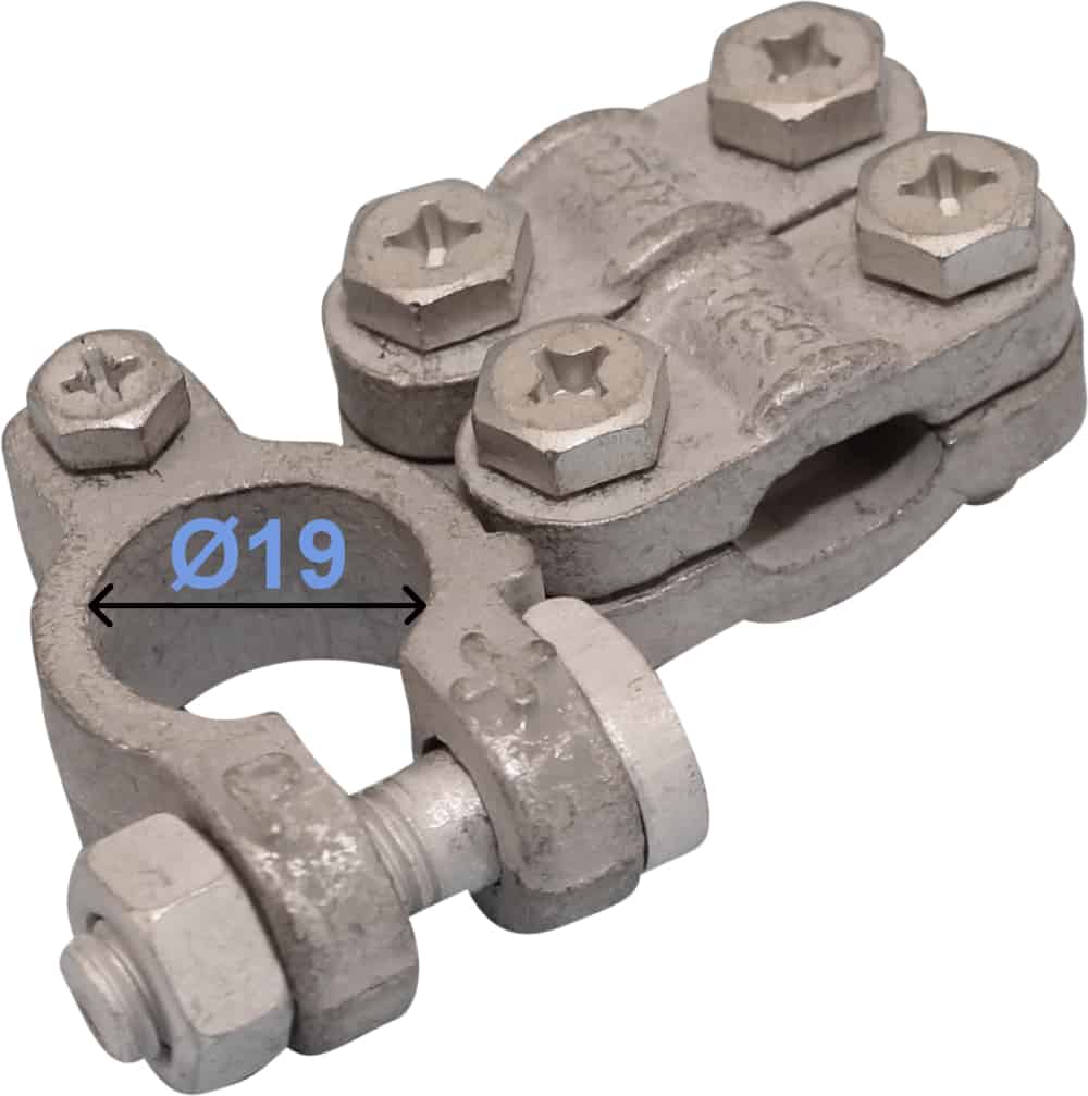 För + pol Positiv. Stolpdiameter Ø 19 mm Material: Mässing Mässing, förtennad Kabelstorlek: 35 - 70 mm² Skruvanslutning, rätvinklig Med 5 mm skruvanslutning för ljus, form J