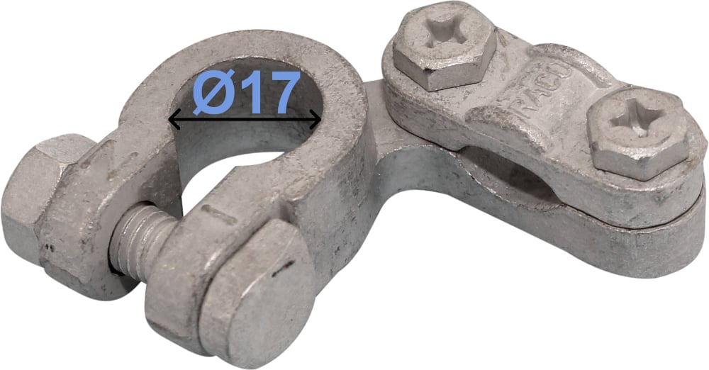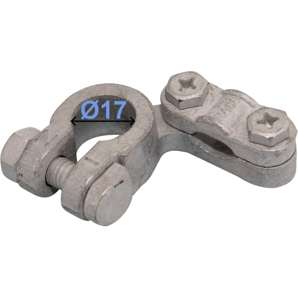 For – pol Negativ. Pol diameter Ø 17 mm Materiale: Messing, fortinnet Kabelstørrelse: 35 – 70 mm² Skruetilslutning, høyrevinklet DIN 72331, form D