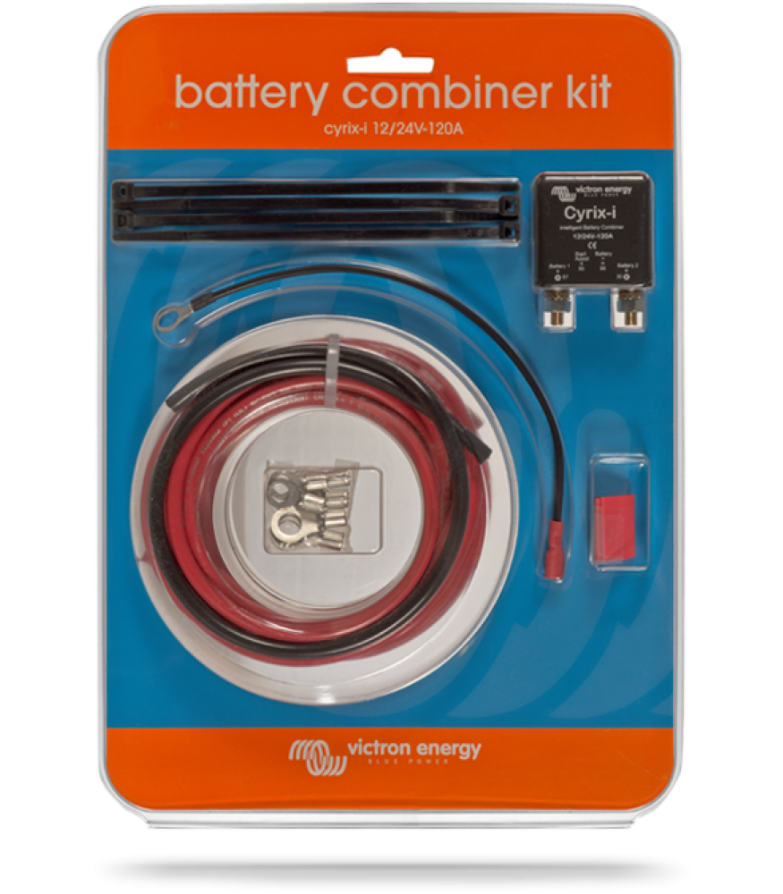 Victron batterifrånskiljningsrelä på 120A til 12V eller 24V Komplett kit med allt som behövs – kablar, buntband och tillbehör (levereras i blisterförpackning). Används mellan två batteribankar för att säkerställa att dessa inte laddas ur mot varandra. Batteribank 1 (t.ex. startbatteriet) har högsta prioritet och