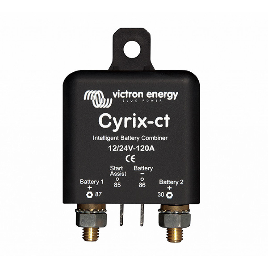 Victron batterifrånskiljningsrelä 120A för 12V eller 24V Används mellan två batteribankar för att säkerställa att dessa inte laddas ur mot varandra. Batteribank 1 (t.ex. startbatteriet) har högsta prioritet och laddas först, antingen från generatorn eller andra laddkällor. Reläet öppnar först när batteri 1 är